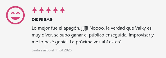 Desde monólogos de humor en teatros hasta actuaciones en eventos privados, Valky ofrece un show único, lleno de sarcasmo, humor cotidiano y risas aseguradas.